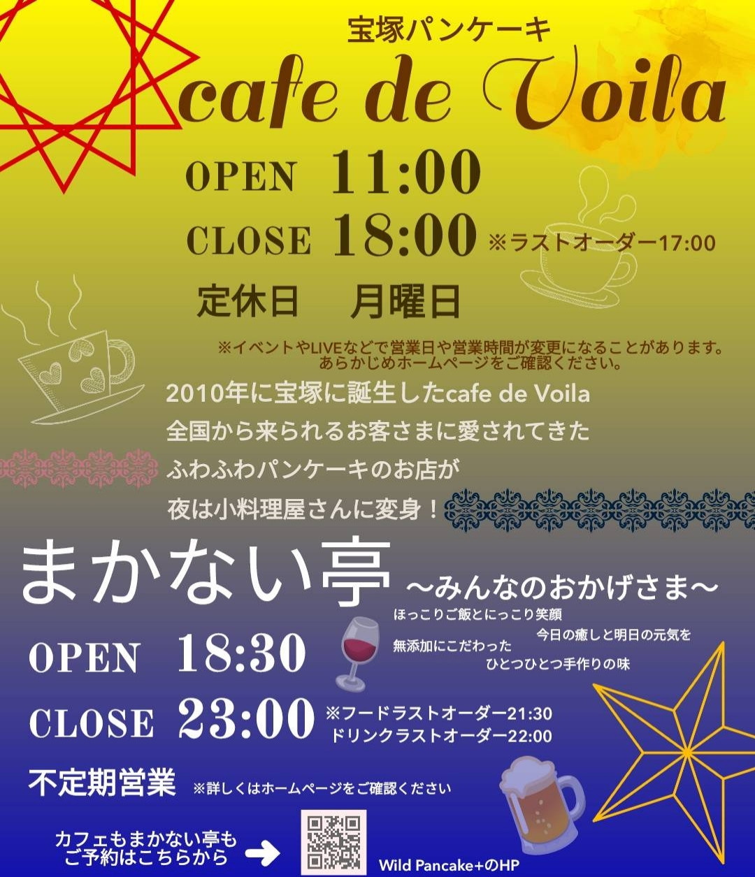 9/17(水)よりcafe de Voilaにて ほっこり夜ごはんのお店 『まかない亭』開店!! 営業時間は18:30〜23:00 ※フードラストオーダー21:30 ドリンクラストオーダー22:00 ご予約の際は、お時間と人数を連絡事項欄にご記入お願い致します。